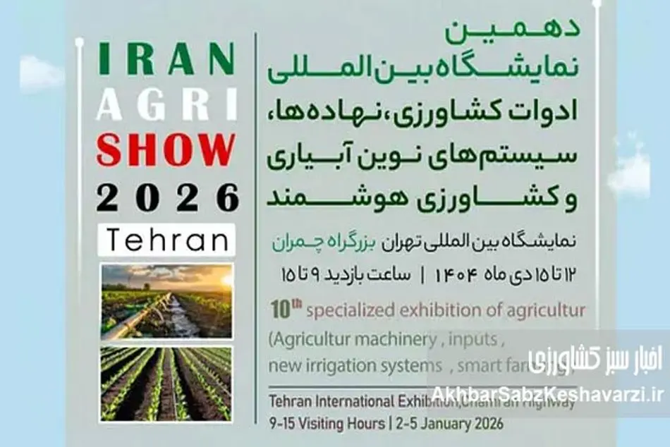 دهمین نمایشگاه بین‌المللی ماشین‌آلات و ادوات کشاورزی، نهاده‌ها و سیستم‌های نوین آبیاری  (Iran Agri Show 2026) از ۱۲ تا ۱۵ دی‌ماه ۱۴۰۴ در محل دائمی نمایشگاه‌های بین‌المللی تهران برگزار خواهد شد.