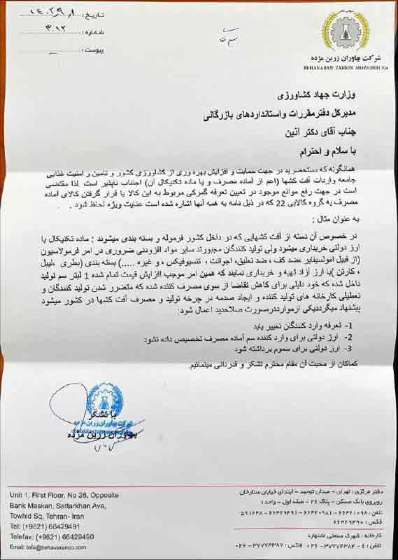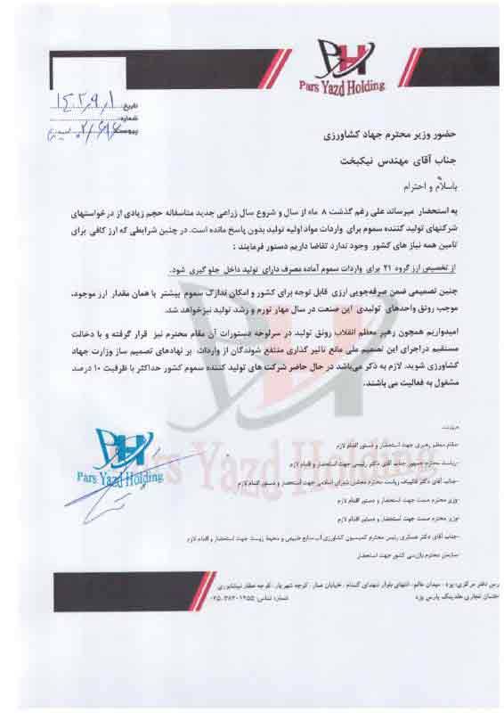 در همین راستا، نامه شرکت بهاوران زرین مژده به وزارت جهاد کشاورزی همچنان بدون پاسخ مانده تا مافیای واردات کل سموم وارداتی را وارد کند.